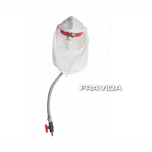 Capuchón Antipolvo Presurizado. Características: Amplio visor de policarbonato transparente ceñido al cuello con inyección de aire por sistema de barrido lateral. Cuenta con arnés regulable. Se conecta a través de un tubo corrugado plástico con los art. 7600, 7650 o 7700 (Válvula de paso constante y otras). Usos: Para tareas en lugares contaminados con polvos o también para ambientes estériles. Cumple con normas IRAM 3630 y 3595